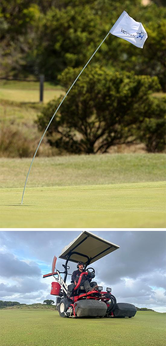 Photos (from top down): Strong winds buffeted the Beach Course during the final round of the 2025 Vic Open at 13th Beach. Cooper Stephens triplex cuts the 13th Beach greens. Due to the strong winds on Sunday, greens weren't cut on either Saturday night or Sunday morning (photos courtesy of Australian Golf Media and Steve Hewitt)
