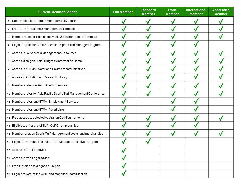 The below table outlines the most comprehensive range of benefits offered in the industry that members receive from joining the leading Sports Turf Management Association in Australia: