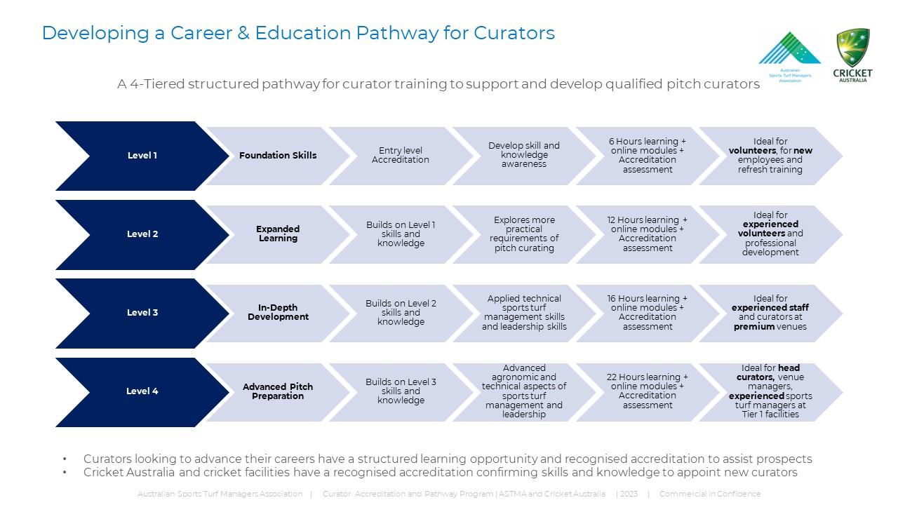 The Accreditation courses are a combination of skill and knowledge development, comprising elements of face to face learning, virtual learning modules, and online assessments to ensure skill, knowledge and competency is attained through each level of Accreditation. Accreditation training program will be held at a local (state based) venue, facilitated by senior and experienced curators, and structured to develop a pathway for curator training to support and develop qualified and skilled pitch curators. Cricket Australia and the Australian Sports Turf Managers AssociationThe Accredited Curator Program was developed in conjunction with a Curator Working Group (CWG), comprising representatives of Cricket Australia, Head Curators and the Australian Sports Turf Managers Association, and endorsed to standardise curator training nationally, and assist with the increasing challenges faced by curators in Australia. In 2023, Cricket Australia and the Australian Sports Turf Managers Association entered into an Agreement, endorsing the Accredited Cricket Pitch Curator Program to be implemented nationally to support current and emerging curators. |