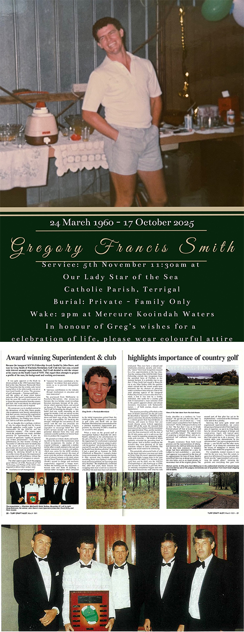The ASTMA is deeply saddened to learn of the passing of former Pambula Merimbula Golf Club superintendent, Rain Bird area manager and TAFE teacher Greg Smith after a courageous battle with brain cancer. Smith, who was just 65, will be farewelled by family and friends at a memorial service next Wednesday (5 November) at the Our Lady Star of the Sea Catholic Parish in Terrigal, NSW followed by a wake at Mercure Kooindah Waters (see details here).